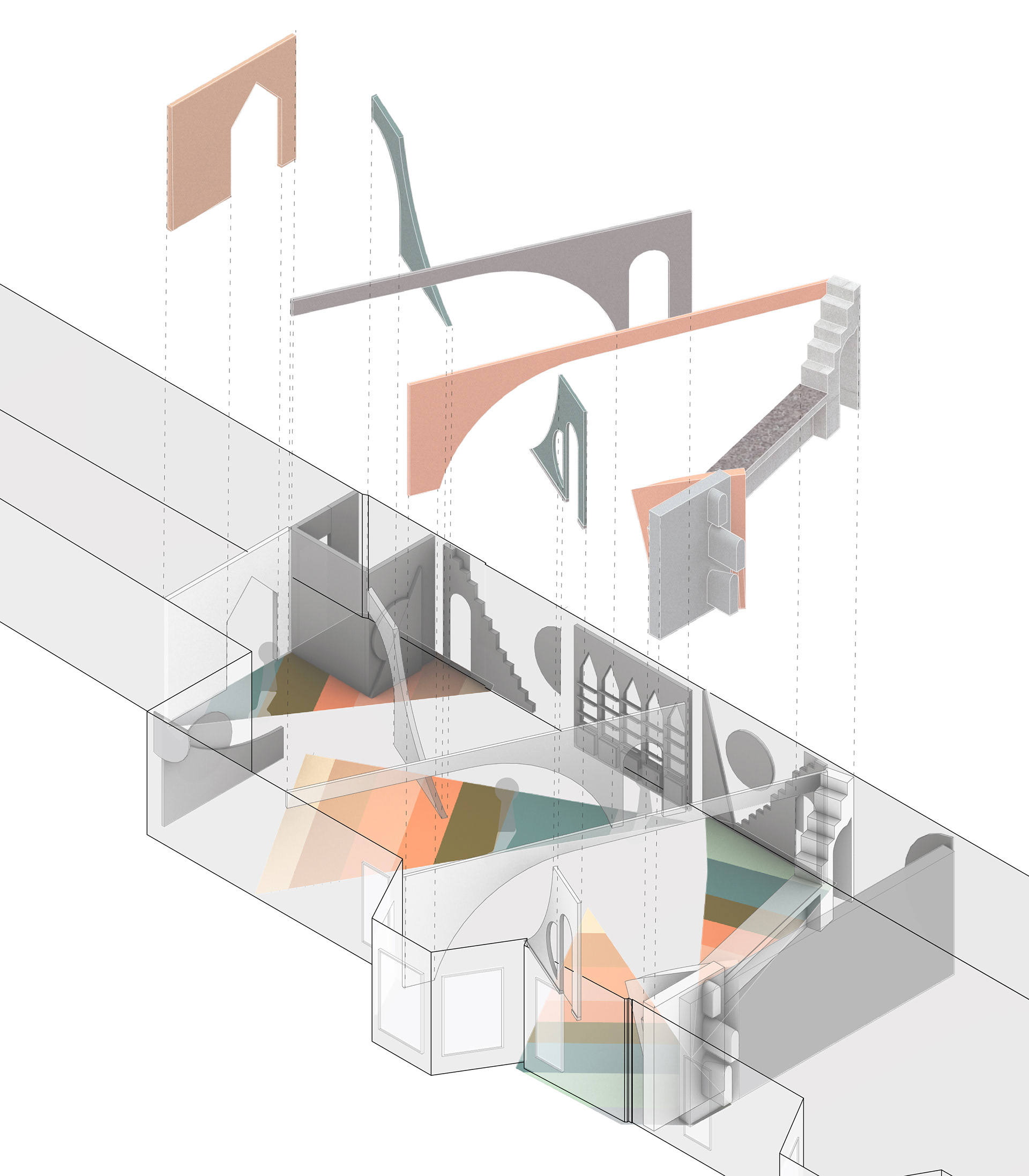 Renesa Architecture Design Interiors Studio took cues from the original deconstructive architecture to create a spatial experience filled with volumetric galleries and partitioned masses.