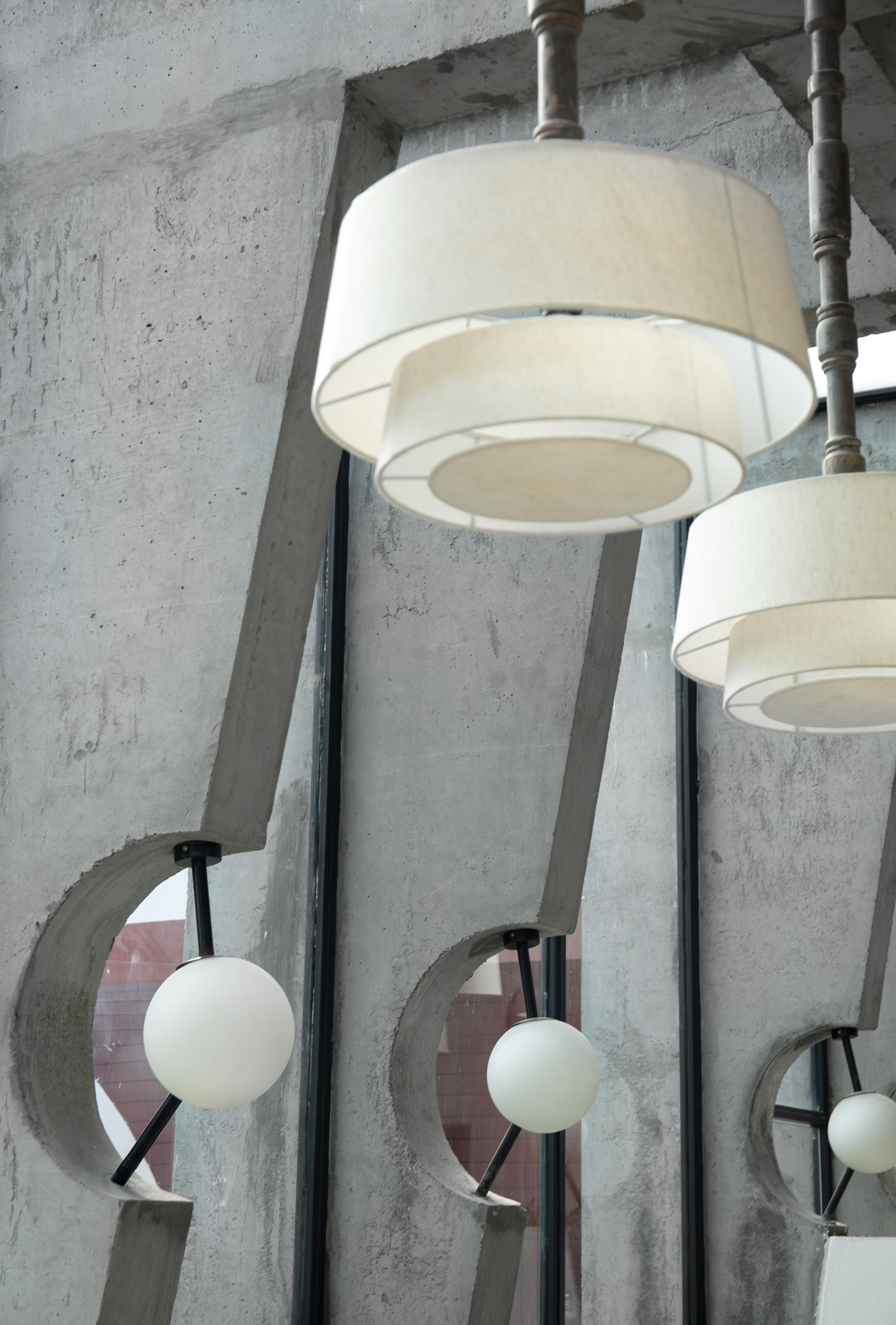 Indoor pendent lamps were customized to be suspended from the ceiling using wooden